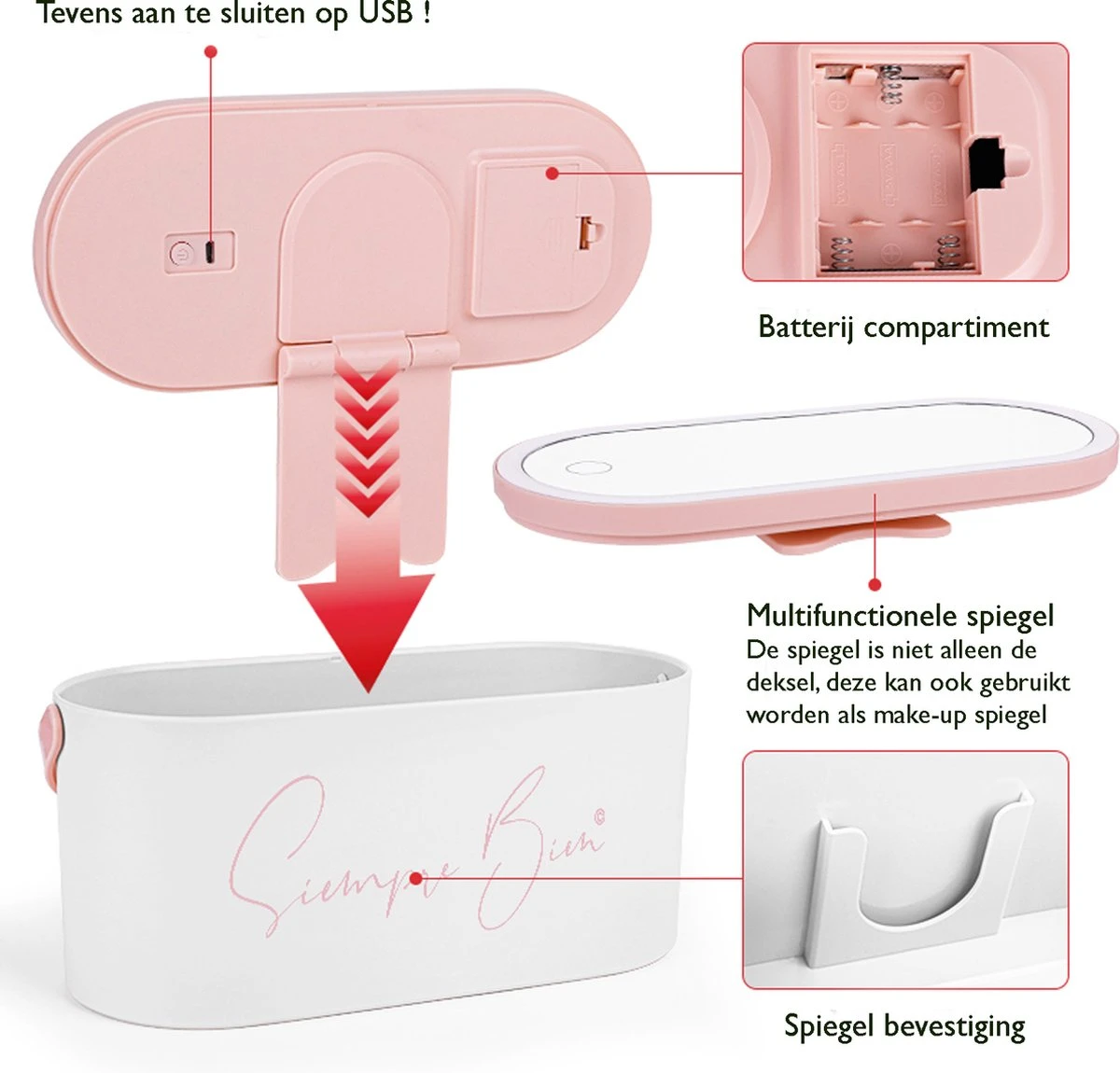 Deze bijzondere Beauty-case wordt gebruikt met 4 AAA batterijen. Maar ook kunt u onze spiegel opladen met de kabel die wordt meegeleverd.