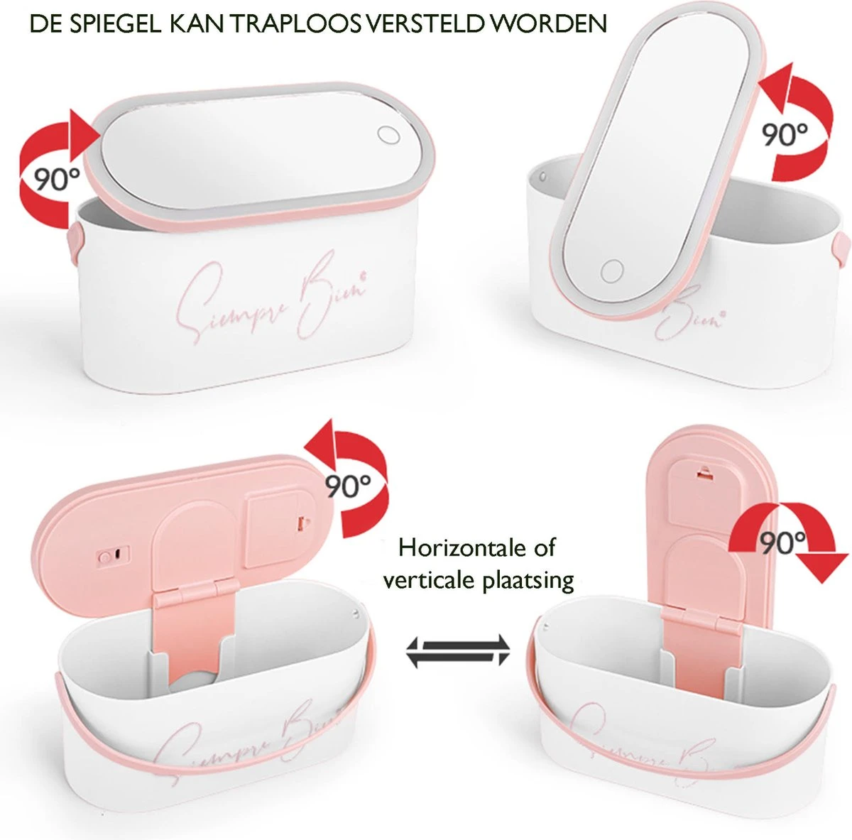 Daarbij zult u vanuit elke hoek de perfecte lichtinval krijgen. Omdat er een draaibare beugel bevindt aan de achterzijden. U kunt dan ook de spiegel van de cae afhalen en zowel horizontaal als verticaal plaatsen op de Beautycase. Zodra de Spiegel dan geplaatst is kunt u die ook nog in verschillende mogelijkheden draaien.