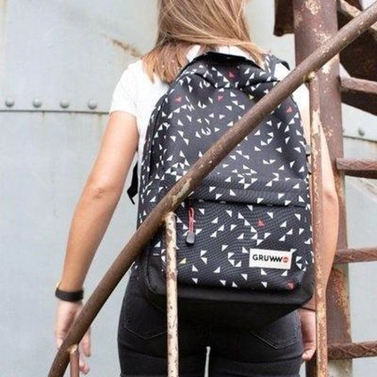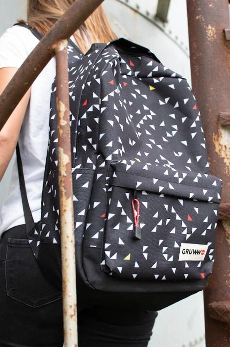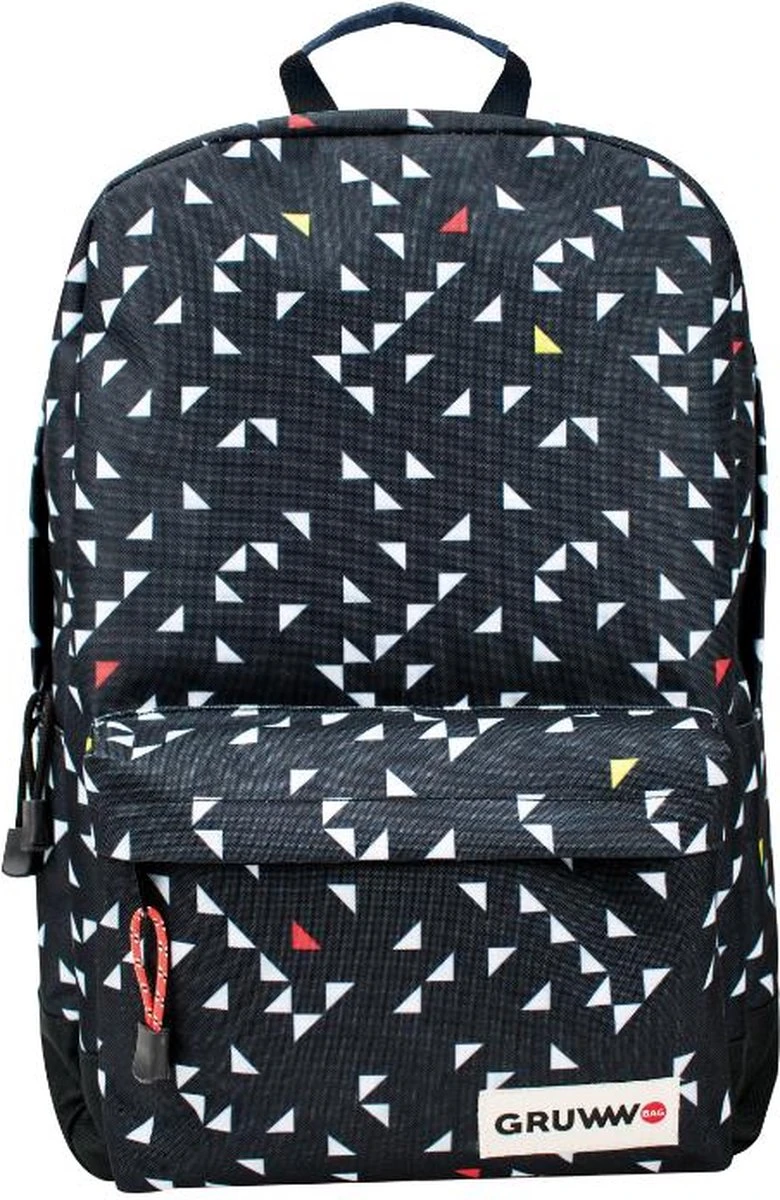 Neem al jouw schoolboeken, kleren of andere spullen mee in deze moderne rugtas van Gruww Maverick. De tas is 43 x 31 x 15 cm en dus groot genoeg voor een 16 inch laptop. De tas heeft een zwarte kleur met driehoeken daarop.