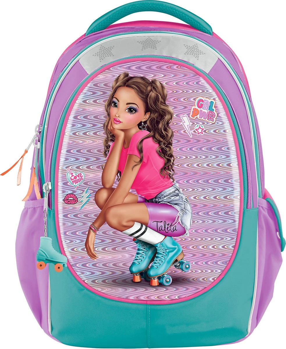 Coole rollerskate stijl voor coole TOPModel fans. De serie Tiny Dancer heeft toffe roze, paarse en turquoise kleuren op een trendy, schitterende hologram achtergrond. De rugzak maakt niet alleen indruk wat betreft de look: hij weegt met een inhoud van ca. 19,6 l slechts ca. 990 gr en heeft een ruim hoofd- en middenvak met verschillende mogelijkheden. In het vakje voorop is ruimte voor een broodtrommel en een flesjes drinken passen perfect in de vakken aan de zijkant. Andere overtuigende eigenschappen: traploos verstelbare banden, fijn gevoerde rug met meshvoering, reflectoren, gevoerde handgreep, lus om op te hangen en geheim vakje met rits aan de achterkant. Het robuuste materiaal en de gecoate boden zijn water- en vuilafstotend. Extra schattig: de hanger in de vorm van een rolschaats aan de rits. Materiaal: 100% PES, materiaal front: 100% PVC. Maten: 44 x 34 x 23 cm.