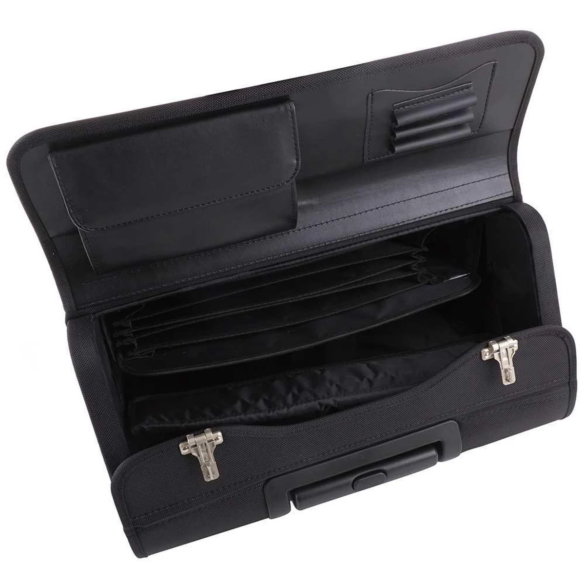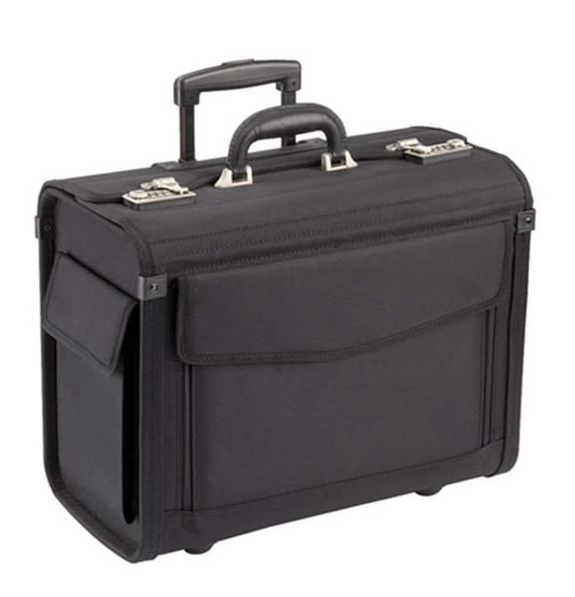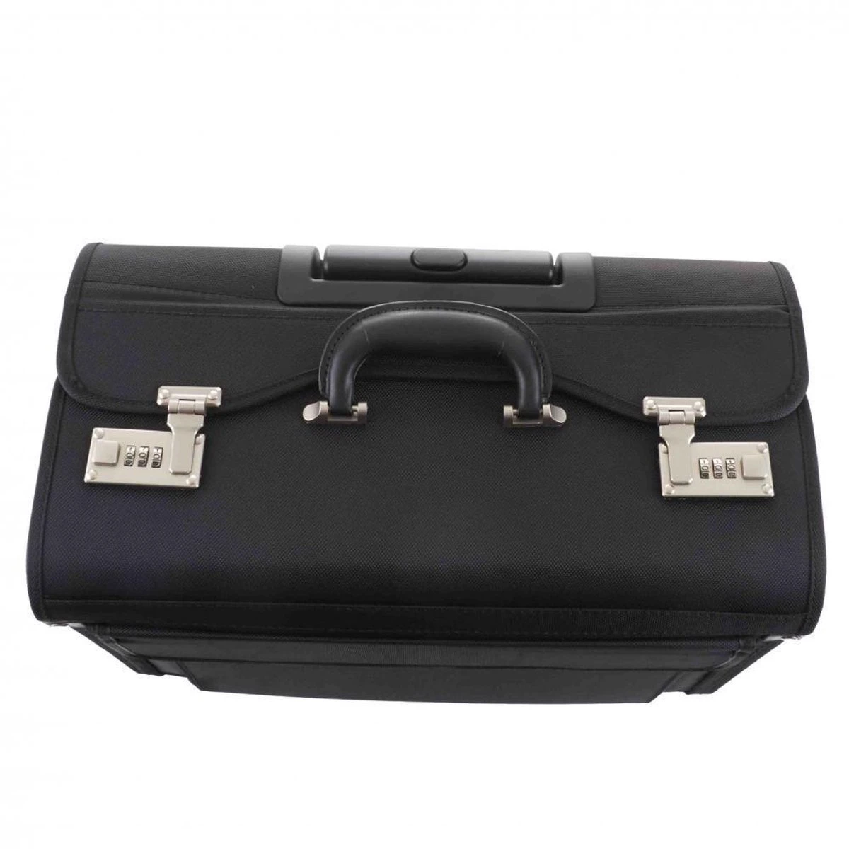 Elegante pilotenkoffer van Dermata gemaakt van hoogwaardig nylon. De Dermata 1340NY pilotenkoffer beschikt over een zeer ruim hoofdcompartiment. In dit vak is er ruimte voor meerdere mappen en een 15 inch laptopvak, uitneembaar. Naast een ruim hoofdvak heeft de koffer een voorvak met tussenschotten van A4-formaat en twee zijvakken. De zwarte pilotenkoffer is af te sluiten door twee kleppen aan de bovenzijde die vergrendeld kunnen worden door middel van twee cijfersloten. Aan de binnenkant van de kleppen zitten meerdere handige vakken voor onder andere reisdocumenten, pennen en een telefoon. Met geïntegreerd trolley systeem en wielen aan de onderkant.