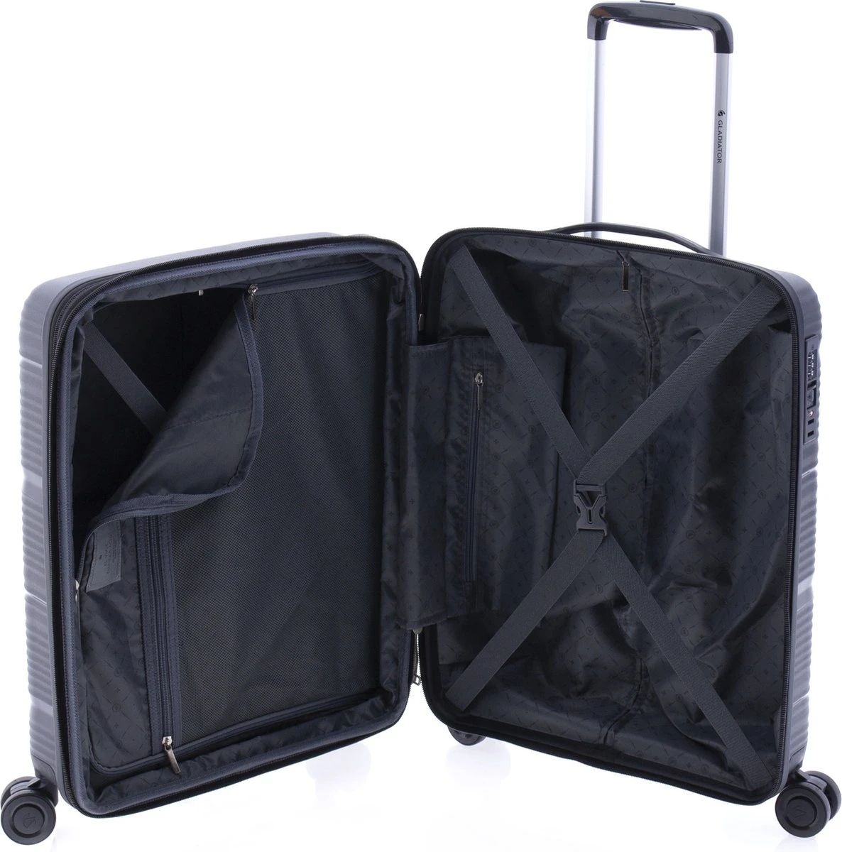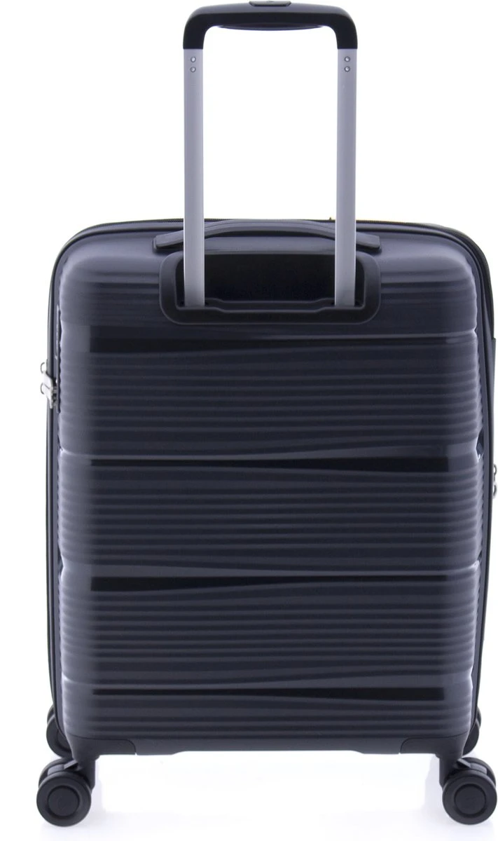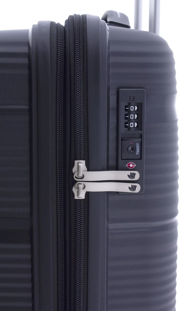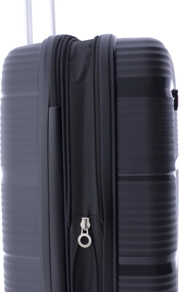 Luxe hardschalen, polypropyleen koffer met dubbele wielen en TSA slot. Koffer is voorzien van een ritssluiting rondom en een extra expandable rits waarmee de koffer qua volume vergroot kan worden van 38 naar 48 liter. Binnenin gevoerd en voorzien van tussenschot met ritssluiting, ritsvakje en spanbanden. Koffer is op slot te zetten middels een vast TSA cijferslot op de zijkant van de koffer. Handvat bovenop en voorzien van comfortabel 4-wiel systeem.