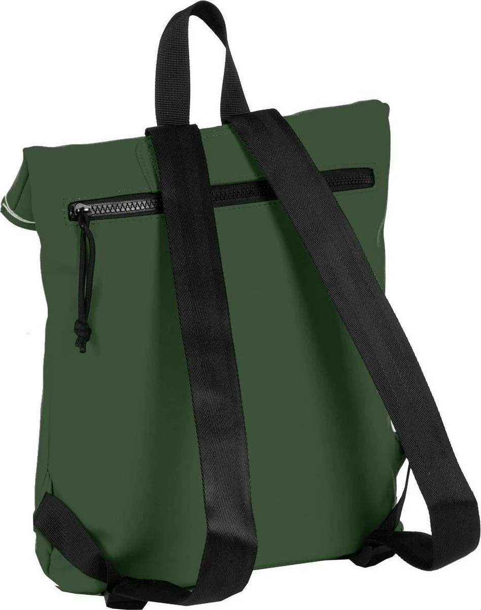 Stoere middelgrote Waterafstotende rugzak uit de Mart serie van New Rebels. De rugzak is gemaakt van tarpaulin. Dit waterafstotende materiaal zorgt er voor dat de tas tegen een stootje kan en jouw eigendommen droog blijven tijdens verschillende weersomstandigheden. Het hoofdvak is afsluitbaar middels een ritssluiting en haaksluiting. De rugzak is oprolbaar ofwel qua volume wat te vergroten danwel te verkleinen. Binnenin zit een ritsvakje en twee steekvakjes voor bijv. je telefoon en sleutels. Op de voorzijde van de tas zit een ritsvak waarin je spullen kwijt kunt die je snel bij de hand wilt hebben. Op de achterzijde zit ook een ritsvak. De twee schouderbanden zijn in lengte verstelbaar. Met de lus aan de bovenkant kan de tas makkelijk opgepakt worden of in de hand gedragen worden.