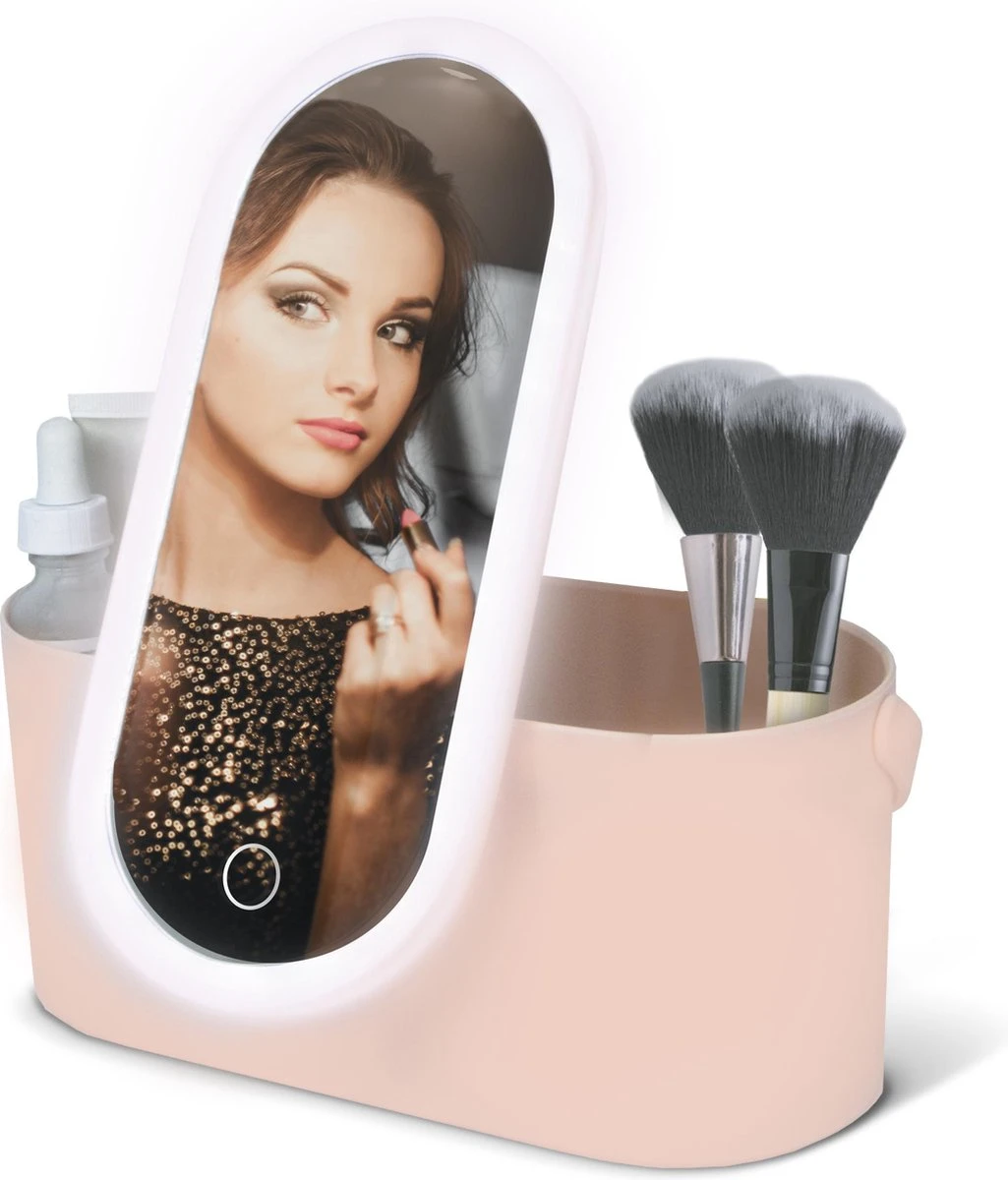 Deze slim ontworpen Travel Beautycase in de kleur Dusty Pink tovert iedere plek om tot een mini make-upstudio. Dankzij de professionele LED-lampjes in de spiegel, die met touch control te bedienen is, heb je altijd de juiste verlichting. Perfect natuurlijk licht voor het aanbrengen van make-up! De beautycase is draagbaar en dus ontzettend handig voor onderweg.