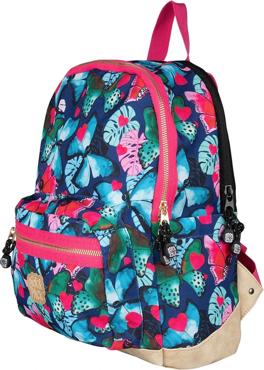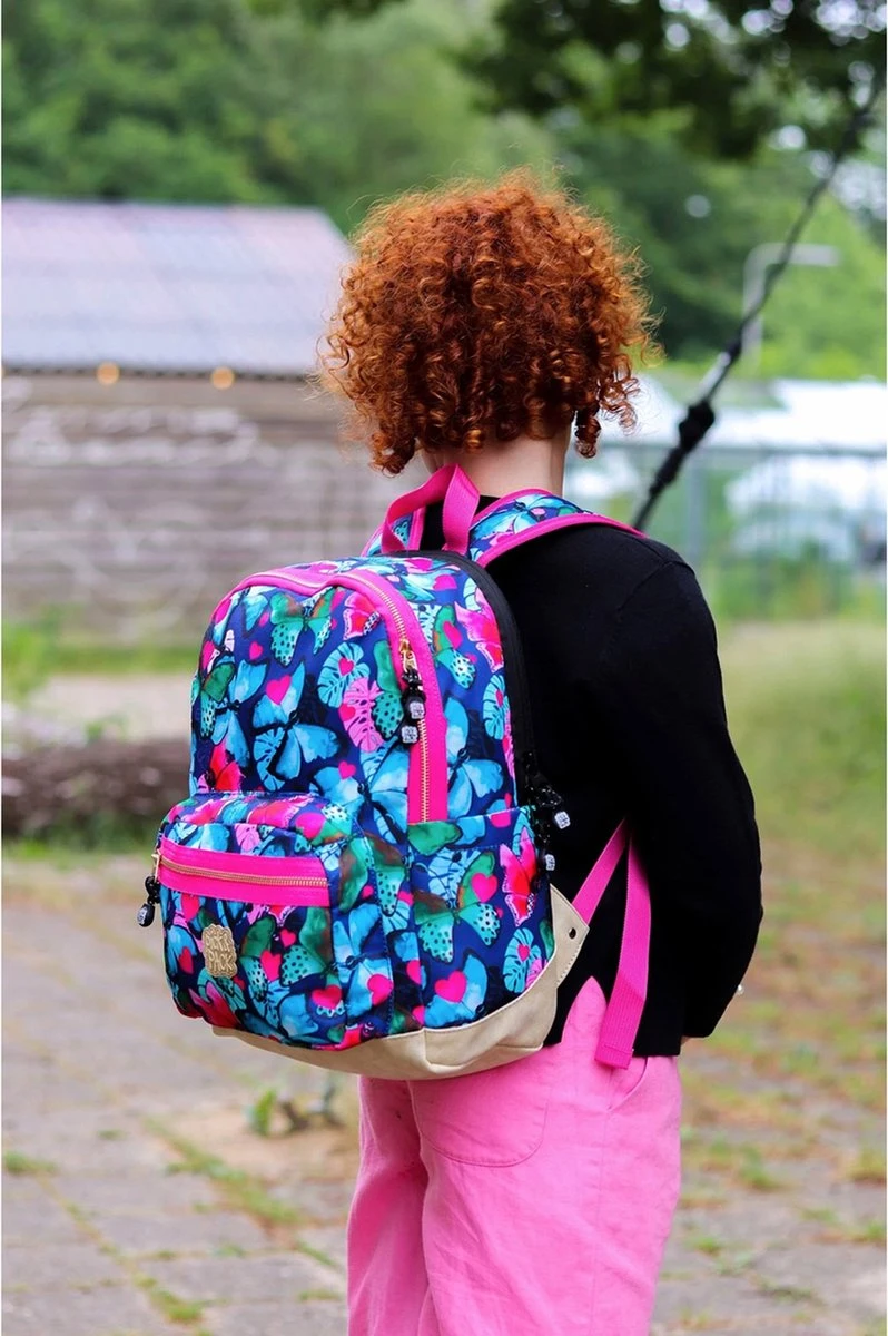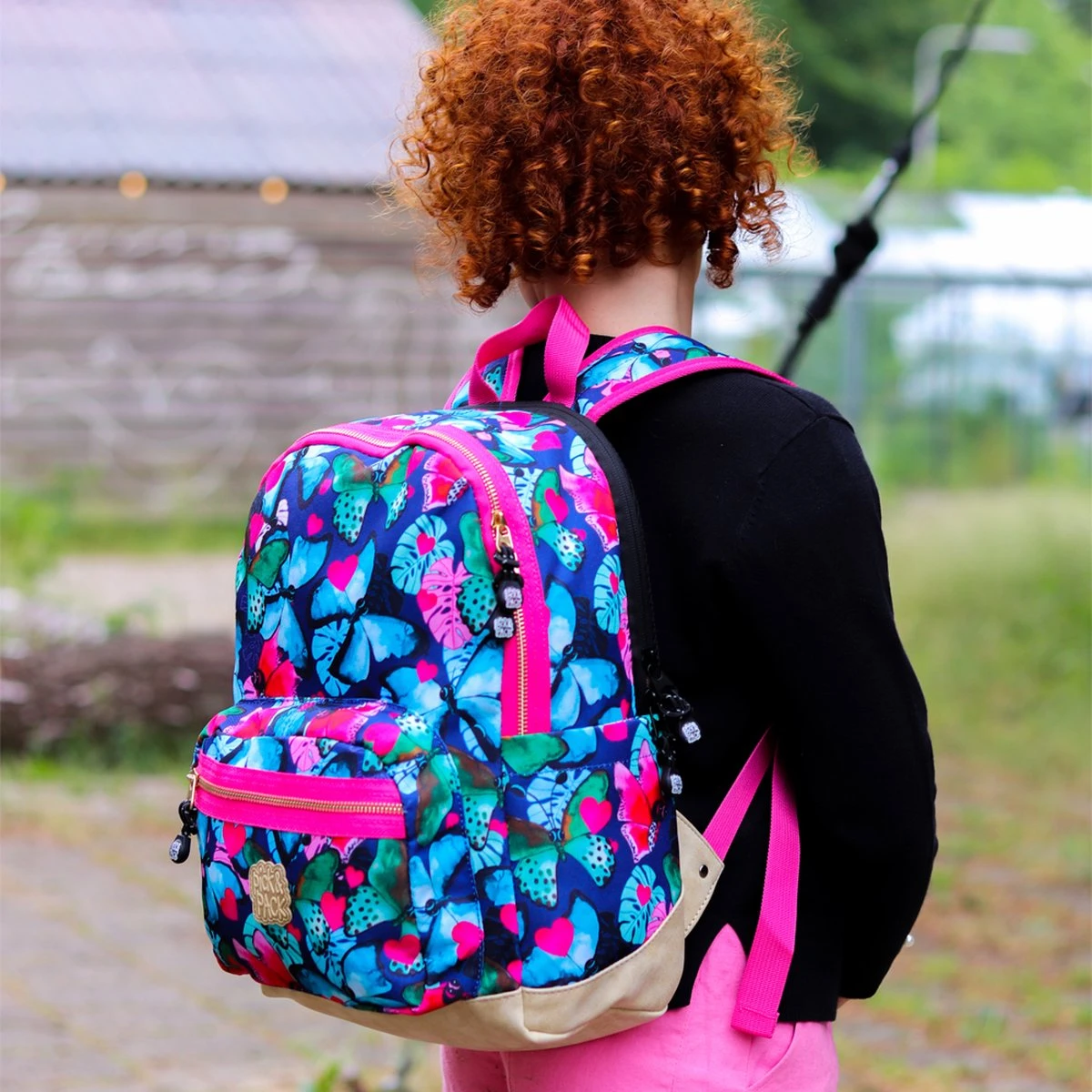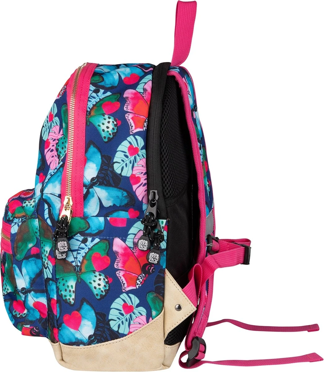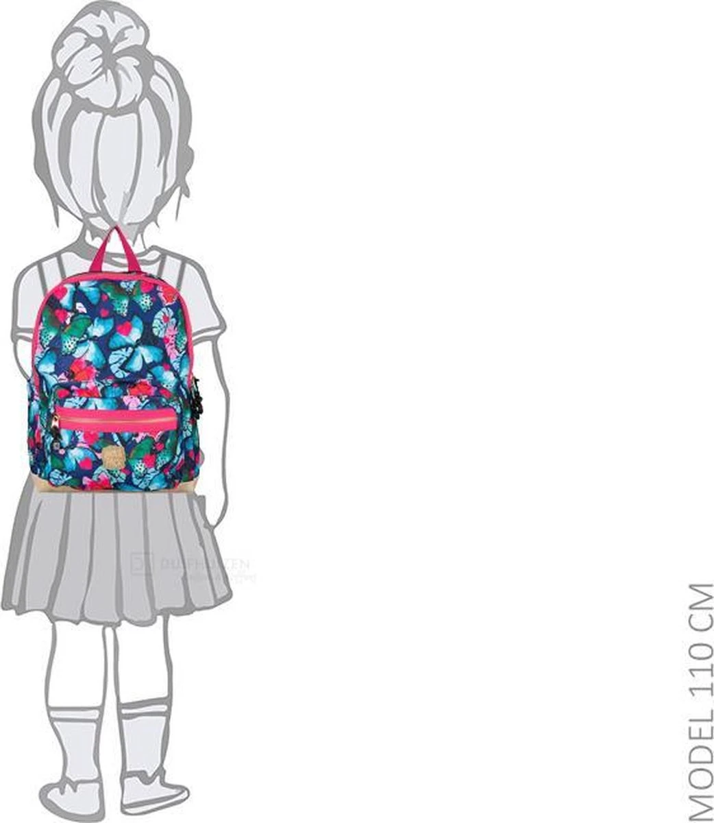 Pick & Pack rugzak in een kleurrijke vlinderprint voor kinderen van 5 jaar en ouder. Dankzij het juiste formaat is de rugtas geschikt voor A4 formaat schoolspullen, een lunchbox en alle andere benodigdheden. Voorzien van een speciaal vak voor een drinkfles. Aan de binnenzijde zit een klein ritsvakje, vakje voor telefoon en een makkelijke sleutelhouder. Met daarop een adres label voor naam, adres en telefoonnummer. Makkelijk voor als de rugtas eens ergens wordt vergeten! Een apart gewatteerd vak is bereikbaar met een rits, hierin kunnen boeken of een 13inch laptop of ipad worden opgeborgen. Voorop een borstbandje om de rugzak stevig vast te maken tijdens het lopen. De rugtas is ook voorzien van kleine reflecterende details zodat je ook in het donker opvalt. Dankzij de gewatteerde schouderbanden en het ergonomische rugdeel is de tas goed door het kind zelf te dragen.