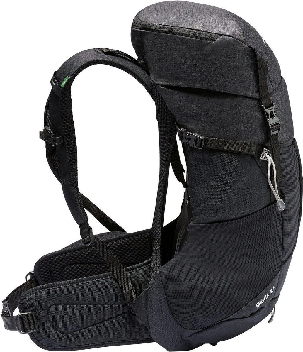 De weg is het doel! De Brenta 24 is een sportieve wandelrugzak voor dagtochten. Door diens innovatieve en zeer goed ventilerende Aeroflex 3D-rugpand, de ErgoShape-schouderbanden en de verstelbare ruglengte past hij zich snel en ongecompliceerd aan en laat zich op veeleisende tochten zeer aangenaam dragen. Compressieriemen zorgen voor stabiliteit in elke draagsituatie. Talrijke extra functies zoals het vak voor waardevolle spullen, het ruime stretchvak aan de voorkant, de bevestiging van wandelstokken, de ruimte voor een drinksysteem of de geïntegreerde regenhoes ronden de Brenta 24 af. Het basismateriaal van deze rugzak bestaat voor 50% uit gerecycled polyester, om onze grondstoffen te besparen. De rugzak is dankzij EcoFinish PFC-vrij waterafstotend. Het VAUDE Green Shape-label staat voor een milieuvriendelijk, functioneel product uit duurzame materialen.